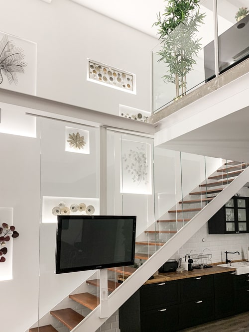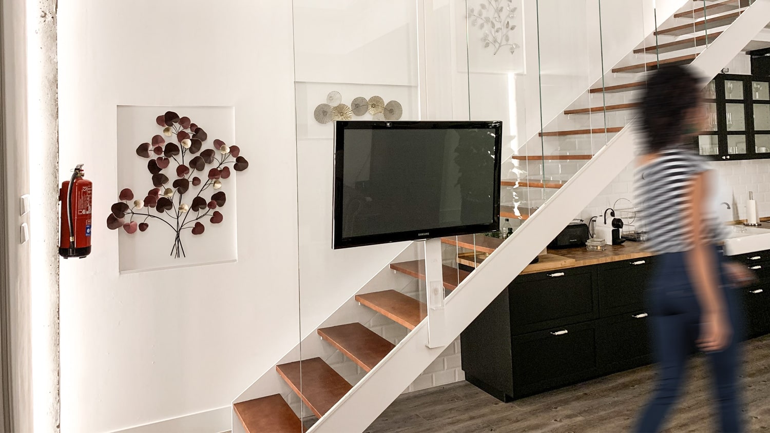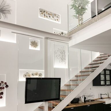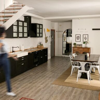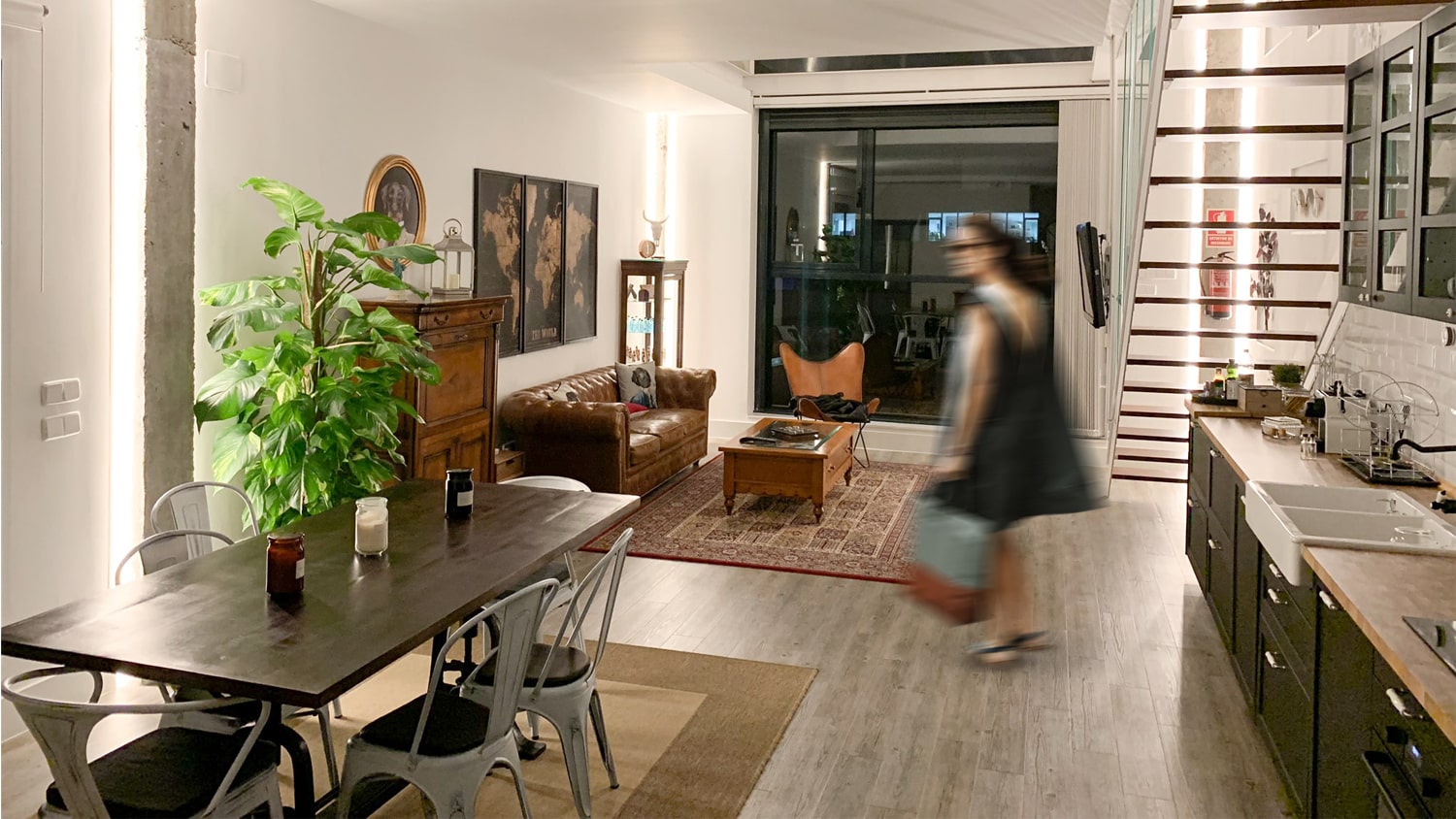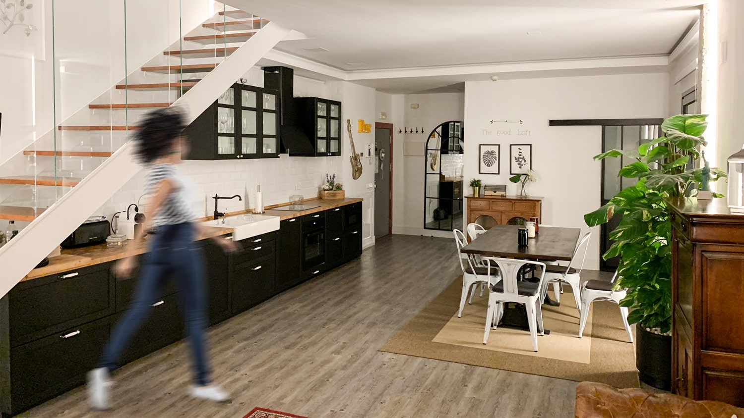 Un pequeño recibidor da paso a la sala principal, donde se reparten de una forma proporcional y equilibrada, la cocina (ubicada de forma lineal y bajo la escalera para aprovechar el espacio y almacenamiento), el comedor y una zona de sofás y televisión al fondo del loft. Preside la estancia un amplio ventanal de dos alturas, que arroja gran cantidad de luz a toda la vivienda.
