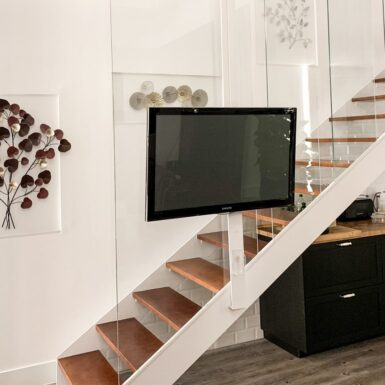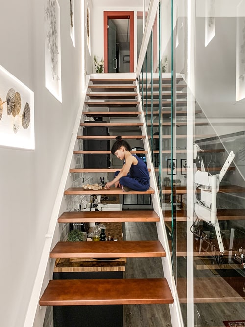 Para maximizar el aprovechamiento del espacio, desde nuestro estudio de arquitectura se planteó una distribución completamente abierta y en dos plantas, de modo que los tabiques no restasen ni luz ni un solo centímetro a este coqueto apartamento.