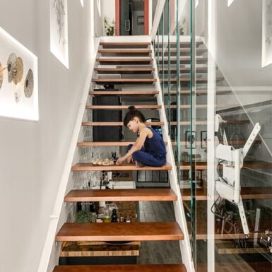 Una escalera volada da acceso a la planta superior, donde se encuentra el cuarto de baño y una habitación, esta última abierta igualmente al salón mediante barandillas de cristal, que le aportan sensación de amplitud y modernidad al espacio.