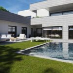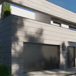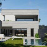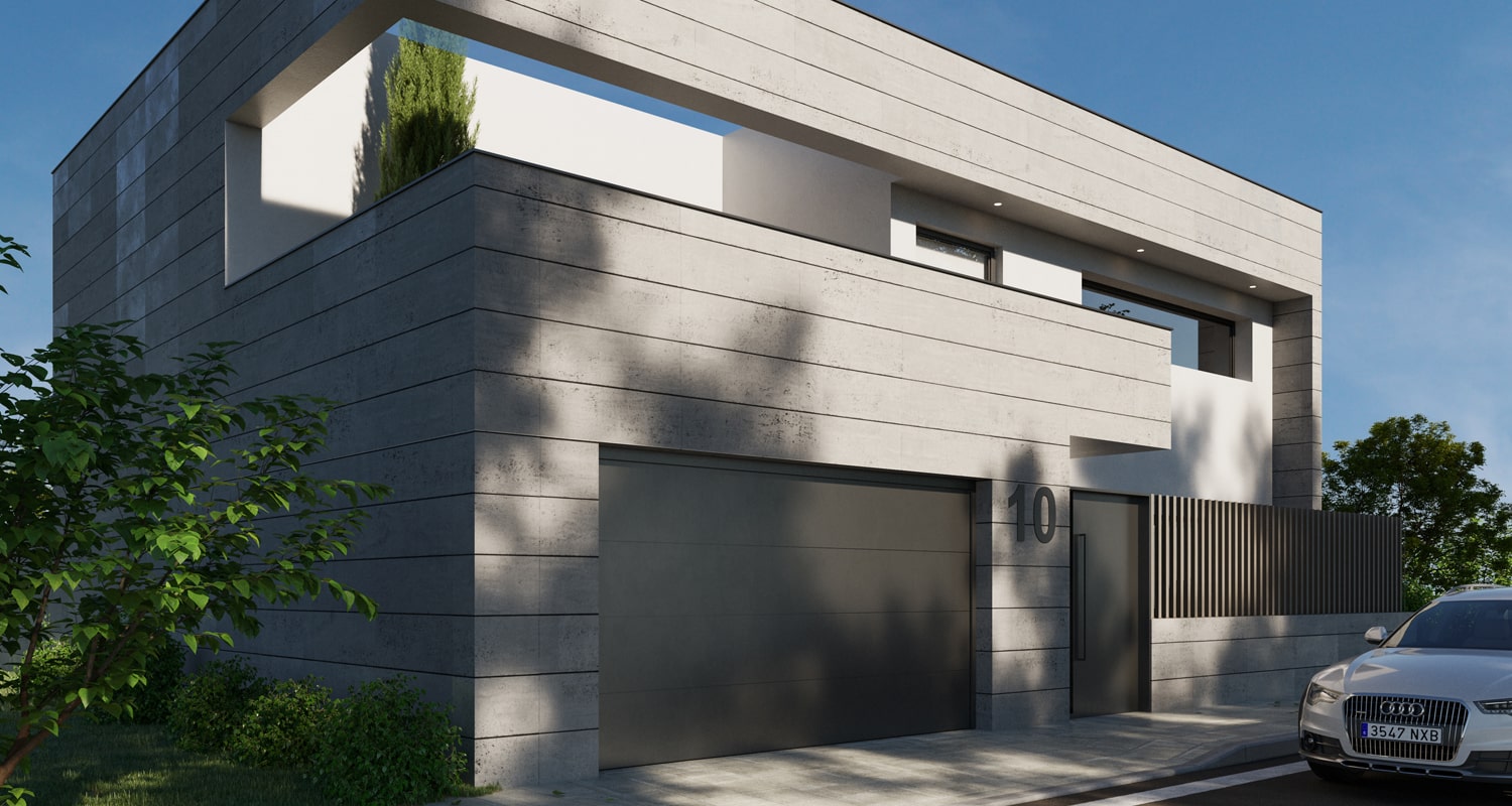 El material utilizado en la fachada es piedra natural, lo que aporta luminosidad y elegancia a la vivienda.