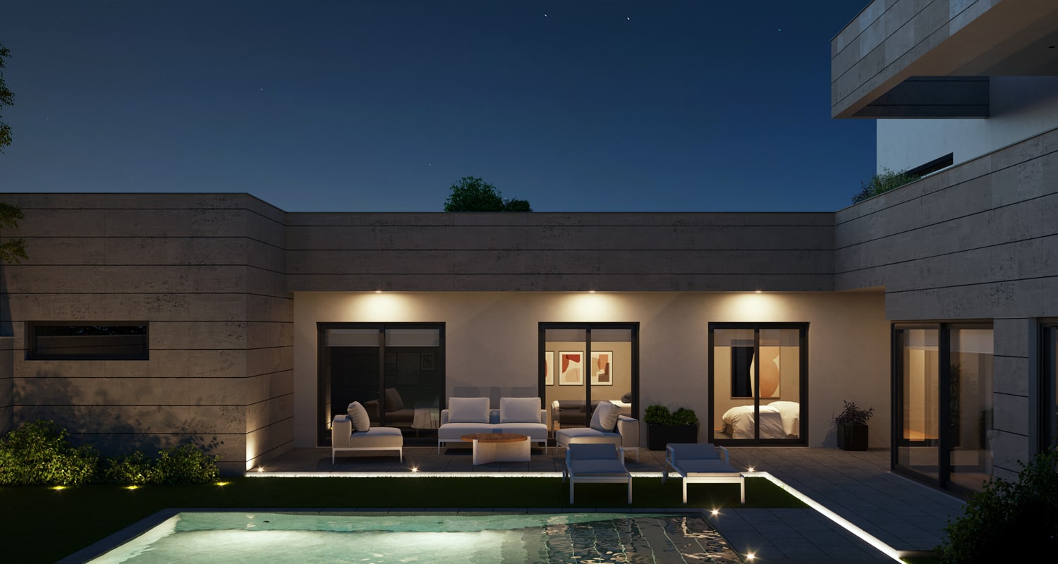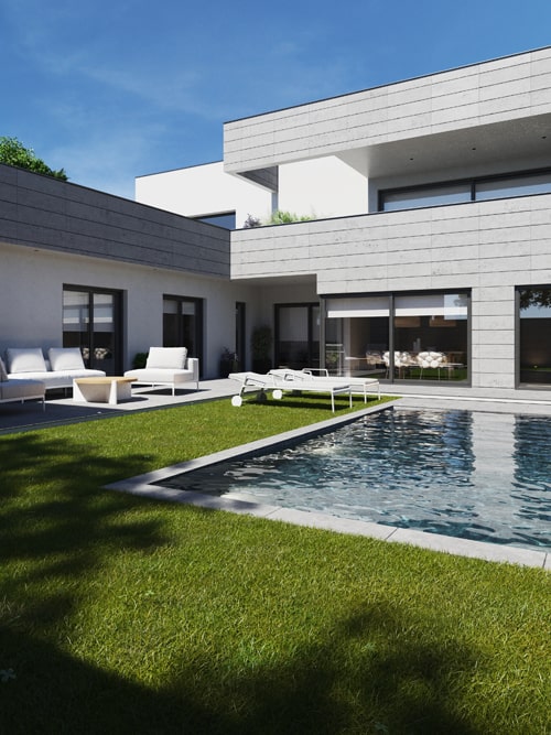 La piscina lateral abre el espacio del jardín, dejando amplias zonas de paso.