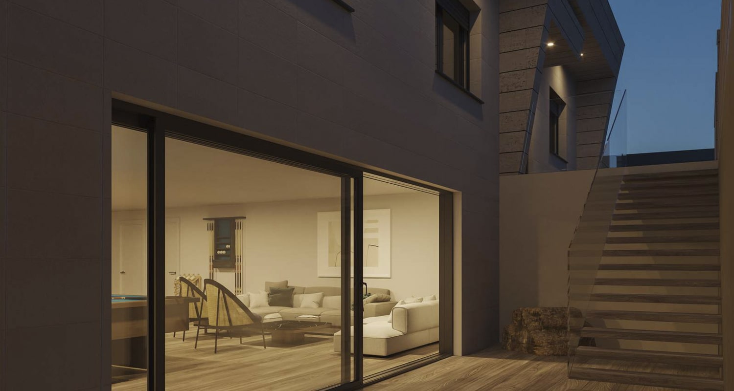 La zona trasera de la vivienda comunica estancias como el salón o la cocina con la piscina. Además, se ha integrado una escalera exterior en esta zona por la que se accede desde el jardín exterior directamente a la segunda planta.