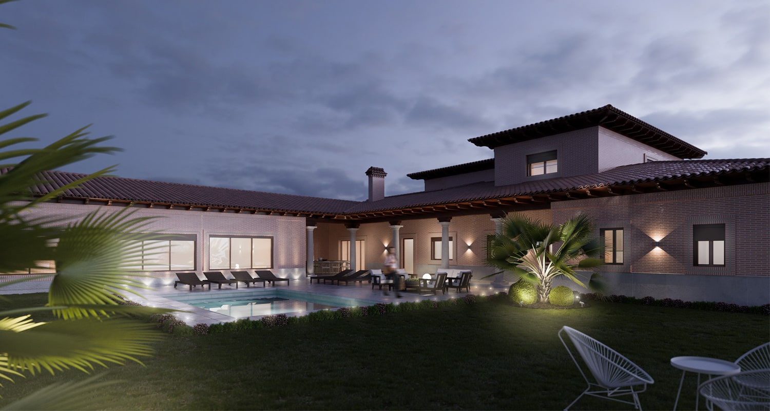 La vivienda está distribuida en forma de L en torno al jardín de la parte posterior, donde está ubicada la piscina que comunica con la fachada principal por uno de sus laterales. Cierra este conjunto de edificaciones un garaje independiente situado también en la parte posterior de la parcela y con capacidad para cuatro vehículos.