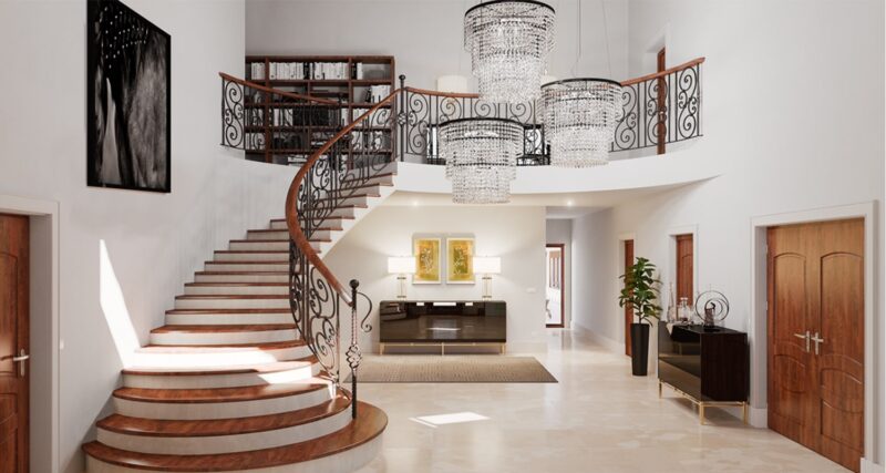 Ya en el interior y nada más acceder a la vivienda podemos contemplar uno de los elementos más llamativos de este diseño: la escalera semicircular que bordea uno de los laterales del recibidor y da acceso a la segunda planta, cuyo distribuidor (aprovechado como biblioteca) queda totalmente abierto al hall.